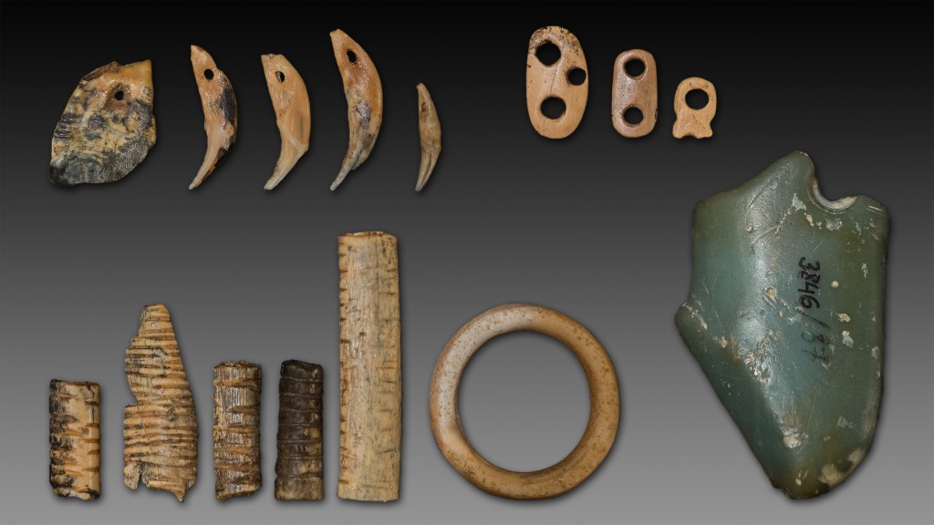 The above picture shows a few of the many artifacts found at Denisova cave including jade bracelets, carved mammoth bones and tooth beads. While it is certainly possible that some of these artifacts are from our Denisovan cousins many might be from human sapiens or Neanderthals as all three species are known to have lived in the cave at various times. (Wikipedia, Denisova Cave)